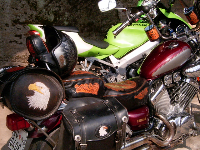 Chapsy pro westernové jezdce,nebo střelce,vyrobeny z hovězí kůže.Délka lze upravit zaříznutím podle potřeby,obvod v pase se upravuje posunutím zadního pásu,sešněrovaného řemínkem.Přeplátování boků je zdobeno ručně řezanými vzory,spínání nohavic karabinkami.